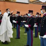 (09-02-2021) Nel pomeriggio di sabato scorso, presso il campo sportivo della caserma Montecuccoli, sede del Reggimento Allievi, il cappellano dell’Accademia Militare, don Marco Falcone, ha officiato una funzione religiosa conclusasi con la benedizione degli spadini degli Allievi Ufficiali del 202° corso “Onore”; secondo tradizione, tale benedizione avviene presso le parrocchie dei luoghi di residenza degli Allievi nel corso della messa di mezzanotte di Natale, ma la contingente situazione sanitaria emergenziale ha inevitabilmente comportato la necessità di una temporanea eccezione.