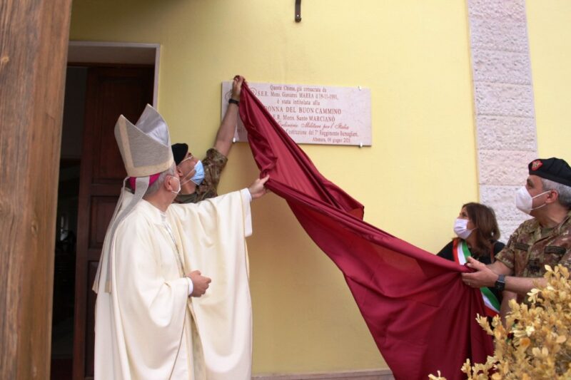 Mons. Marcianò ha proseguito la sua visita presso il 7° Reggimento Bersaglieri, dove ha presieduto una funzione religiosa terminata con la benedizione e l’intitolazione della cappella militare della caserma “Felice Trizio” alla Beata Vergine Maria del Buoncammino, patrona della specialità Bersaglieri. Durante la celebrazione è stato benedetto anche un quadro raffigurante il patrono dell’Esercito Italiano, San Giovanni XXIII. L’inaugurazione della cappella coincide con le celebrazioni del 150° anniversario della costituzione del 7° Reggimento Bersaglieri (1871-2021).