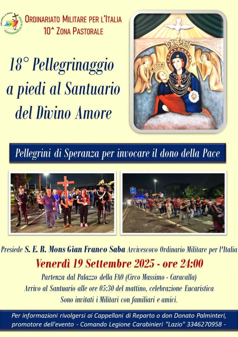 (02-09-2025) È giunto alla diciottesima edizione il pellegrinaggio a piedi al Santuario del Divino Amore. Avrà luogo venerdì 19 settembre alle ore 24, presieduto dall’Arcivescovo Ordinario Militare per l’Italia Gian Franco Saba.