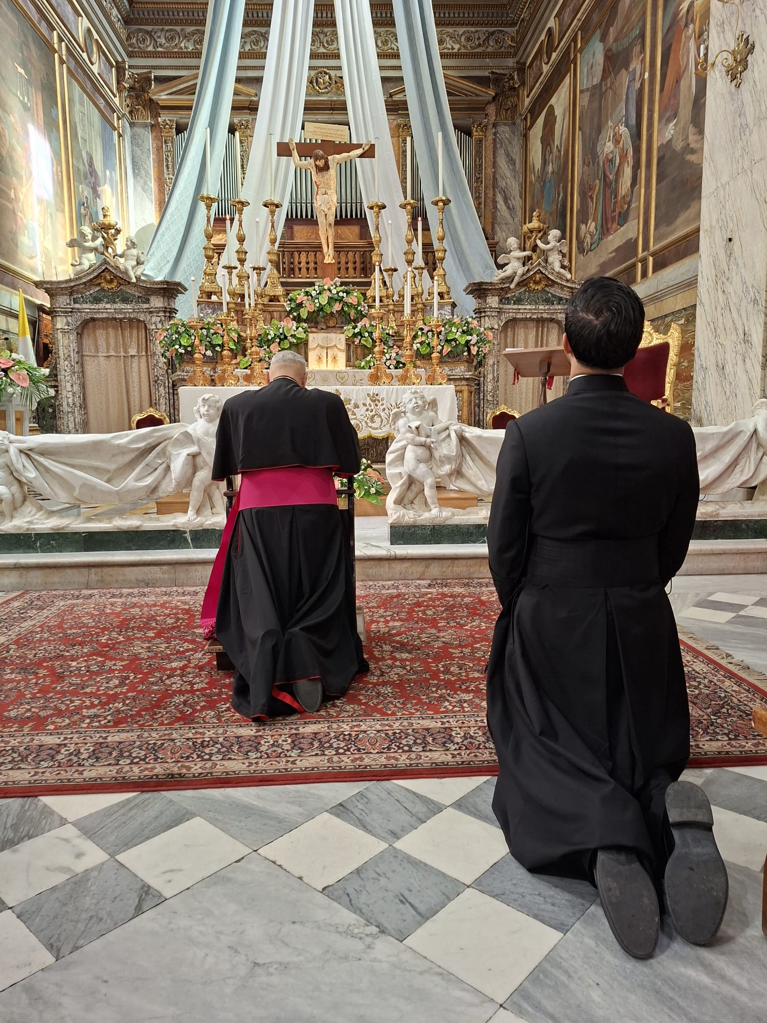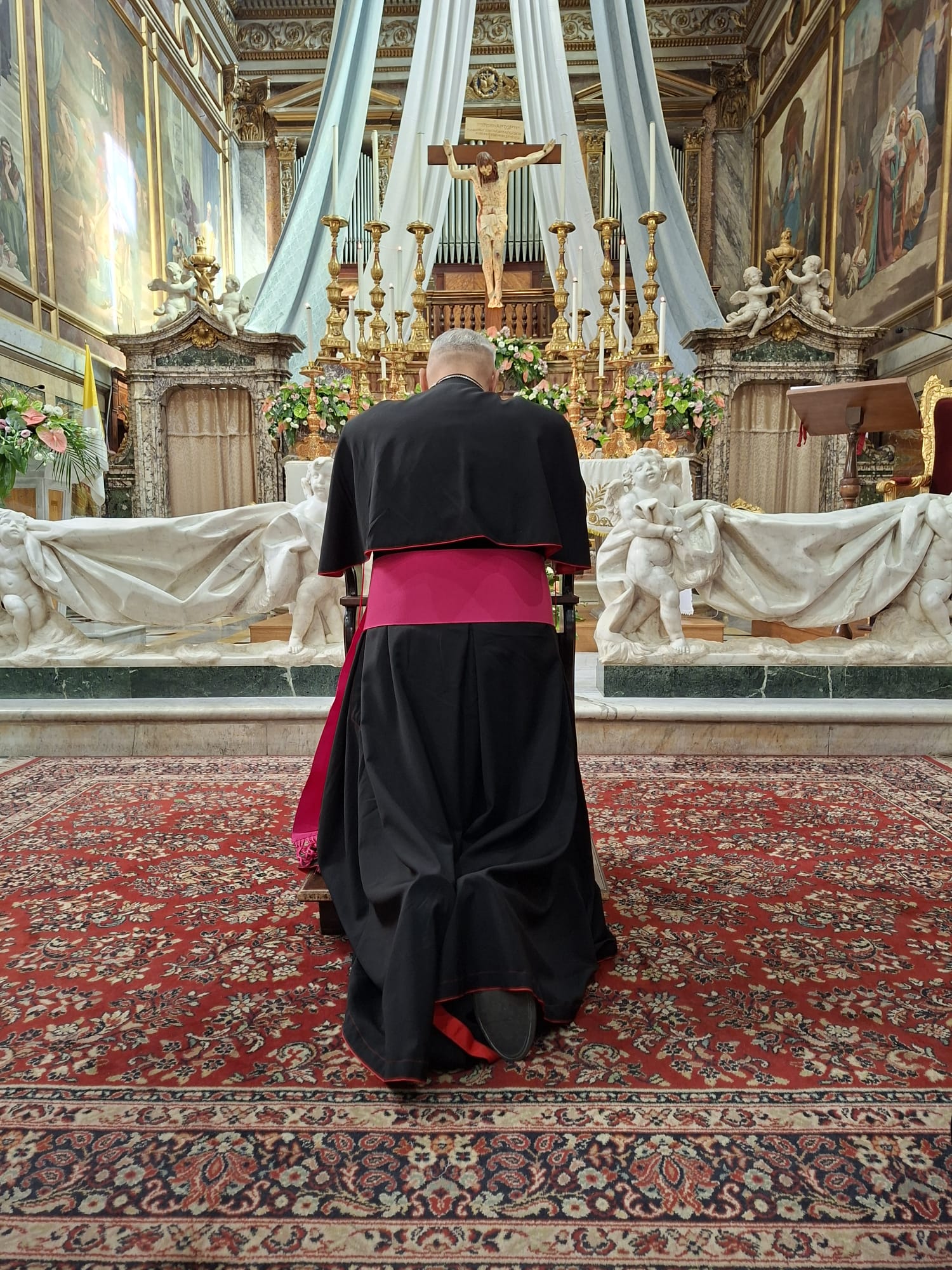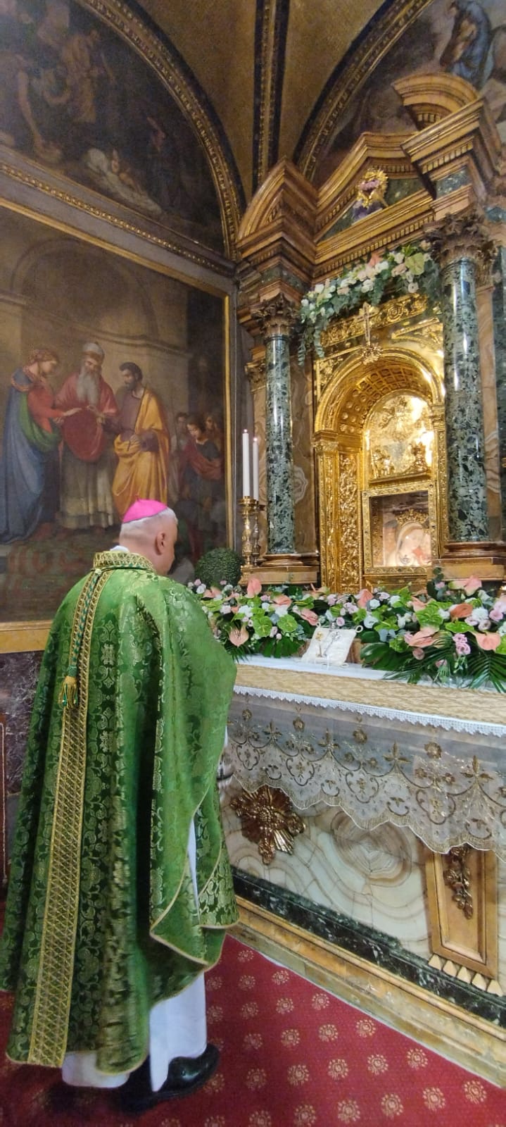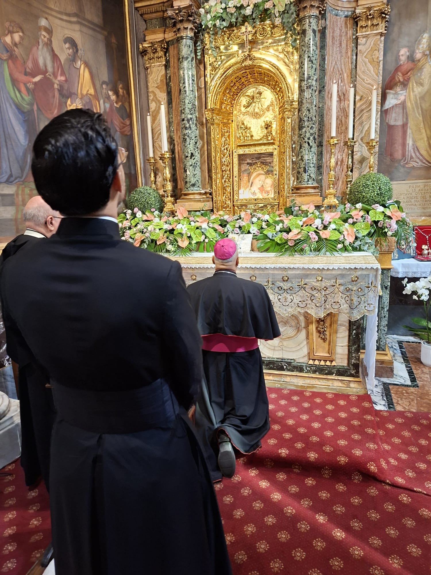 L’Ordinario Militare, prima di iniziare la celebrazione della Santa Messa, si è raccolto in preghiera innanzi alla prodigiosa immagine della Madonna del Buon Consiglio, affidando a lei il servizio della Diocesi Castrense di cui è stato nominato guida dall’Aprile scorso.