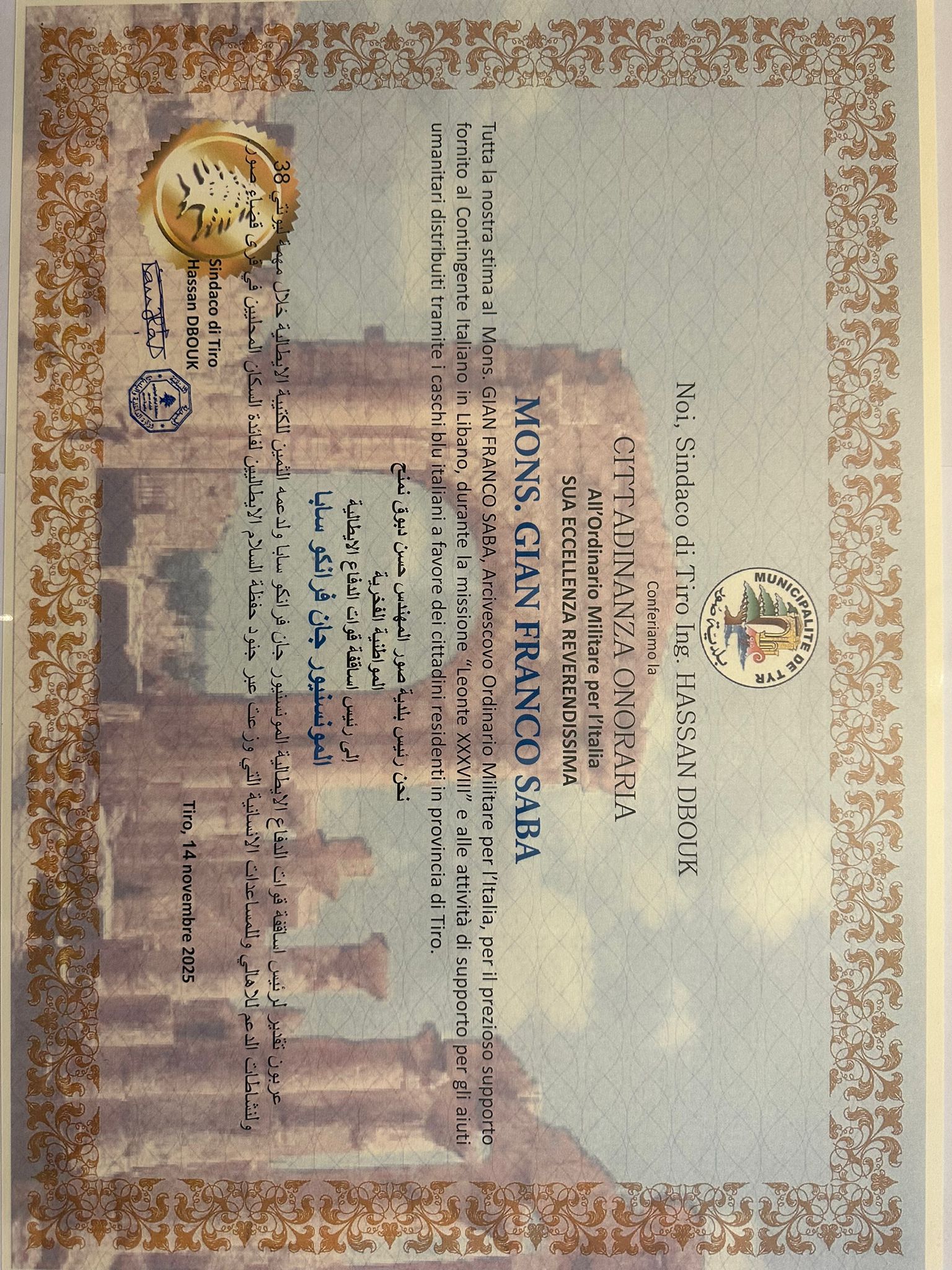(17-11-2025) Nell’ambito della recente visita pastorale in Libano, all’Ordinario militare per l’Italia, mons. Gian Franco Saba, il sindaco di Tiro, ing. Hassan Dbouk, ha conferito la cittadinanza onoraria. Nella motivazione viene espressa la stima al vescovo castrense per il prezioso supporto fornito al contingente italiano in Libano durante la missione “Leonte XXXVIII” e alle attività di supporto per gli aiuti umanitari distribuiti ai caschi blu italiani a favore dei cittadini residenti nella provincia di Tiro. Un riconoscimento di fondamentale importanza se si tiene conto del fatto che è stato attribuito dal primo cittadino, musulmano Sciita, ad una autorità religiosa cristiana. E inoltre la stessa città di Tiro è capoluogo principale del sud del Libano, in cui insiste l’area di operazione.