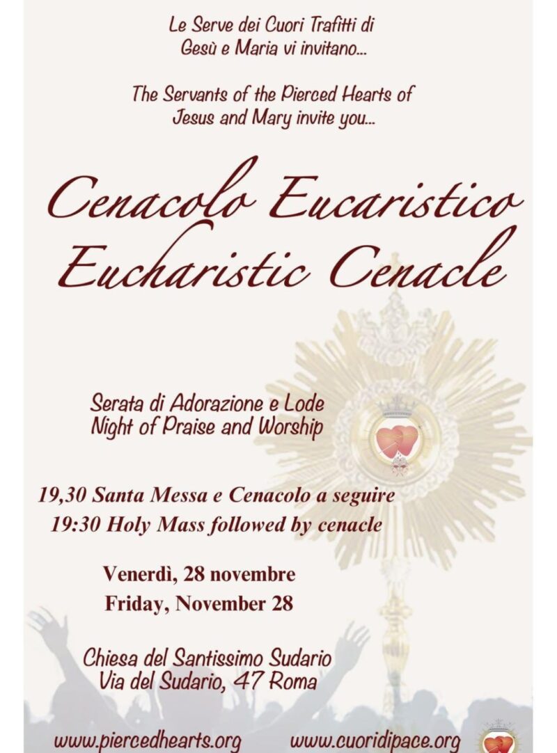 (27-11-2025) Organizzato dalle Serve dei Cuori Trafitti di Gesù e Maria, comunità di religiose che presta il suo servizio per l’Ordinariato Militare per l’Italia, si terrà domani alle 19.30, presso la Chiesa del Santissimo Sudario in Roma, un Cenacolo Eucaristico, preceduto dalla Santa Messa.