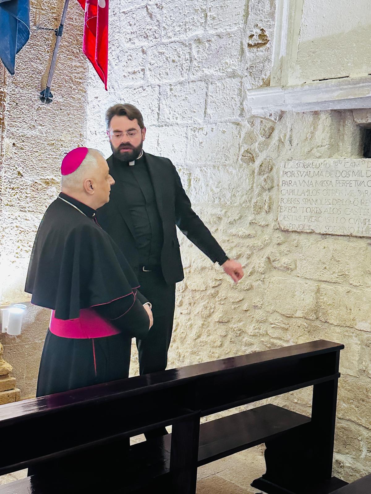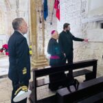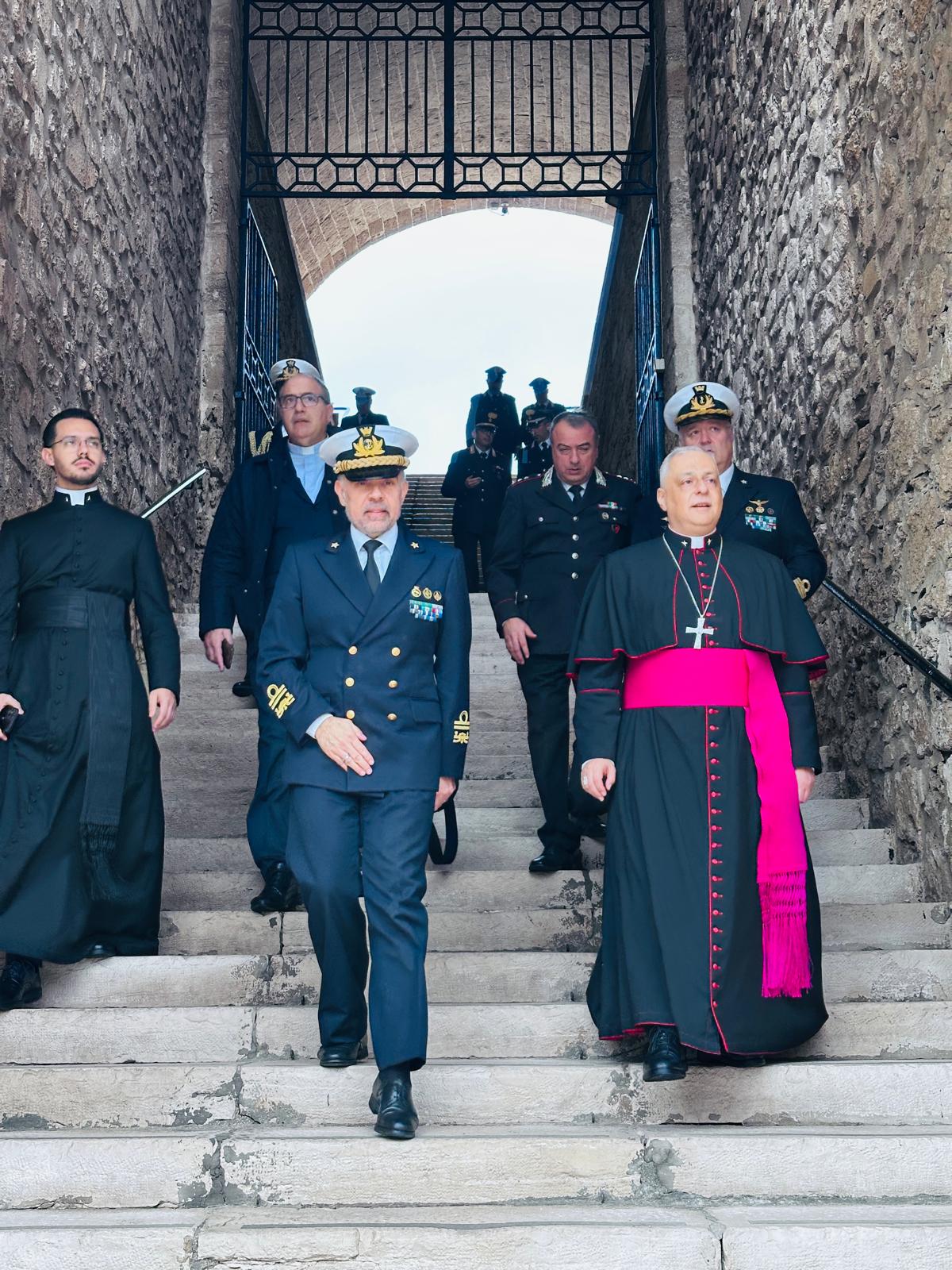Successivamente, l’Ordinario Militare si è recato presso il Castello Aragonese, dove è stato accolto dal Comandante del Presidio Militare di Taranto, Ammiraglio di Divisione Antonio Petroni. Accompagnato dal Cappellano Militare del Comando Interregionale Marittimo Sud, Don Pasquale Didonna, Monsignor Saba ha visitato la Cappella di San Leonardo, sostando in un intenso momento di preghiera, affidando al Signore il cammino dei militari, delle loro famiglie e di quanti operano in ambito militare.