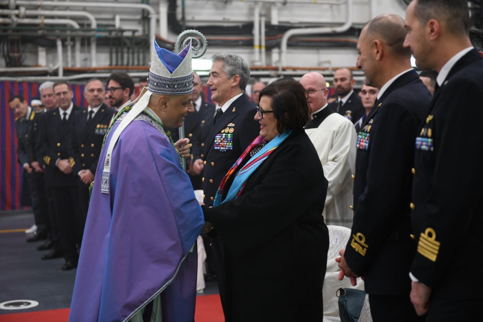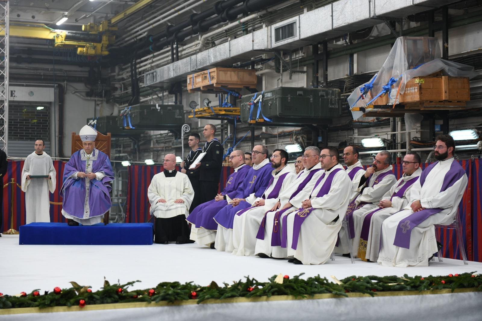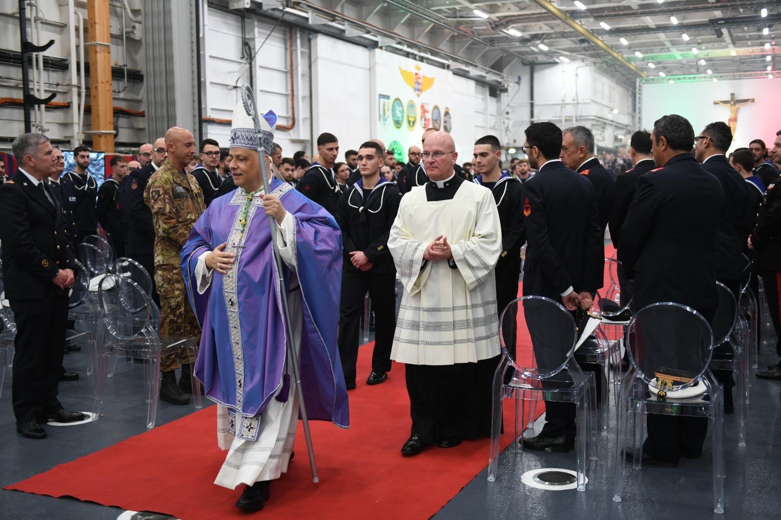 Salito a bordo, l’Ordinario Militare ha salutato il Cappellano Militare della nave, Don Cosmo Binetti, e gli altri Cappellani, convenuti per la concelebrazione eucaristica, cuore spirituale dell’intera giornata.