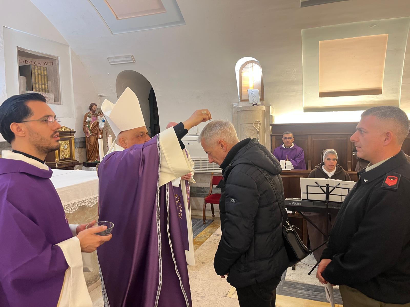 (19-02-2026) In tutte le chiese e cappelle dei tanti reparti i cappellani militari hanno presieduto il rito delle ceneri. L’arcivescovo castrense Gian Franco Saba l’ha officiato a Roma, nella Cripta della chiesa di Santa Caterina a Magnanapoli. Concelebranti: il vicario generale mons. Sergio Siddi, il segretario dell’Ordinario don Giovanni Tanca, il rettore di Santa Caterina Don Pasquale Madeo, il cancelliere don Giancarlo Caria, ed inoltre, don Cataldo Letizia, mons. Nino Romano e don Vincenzo Venuti.