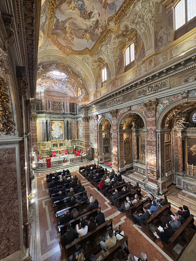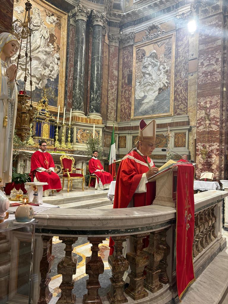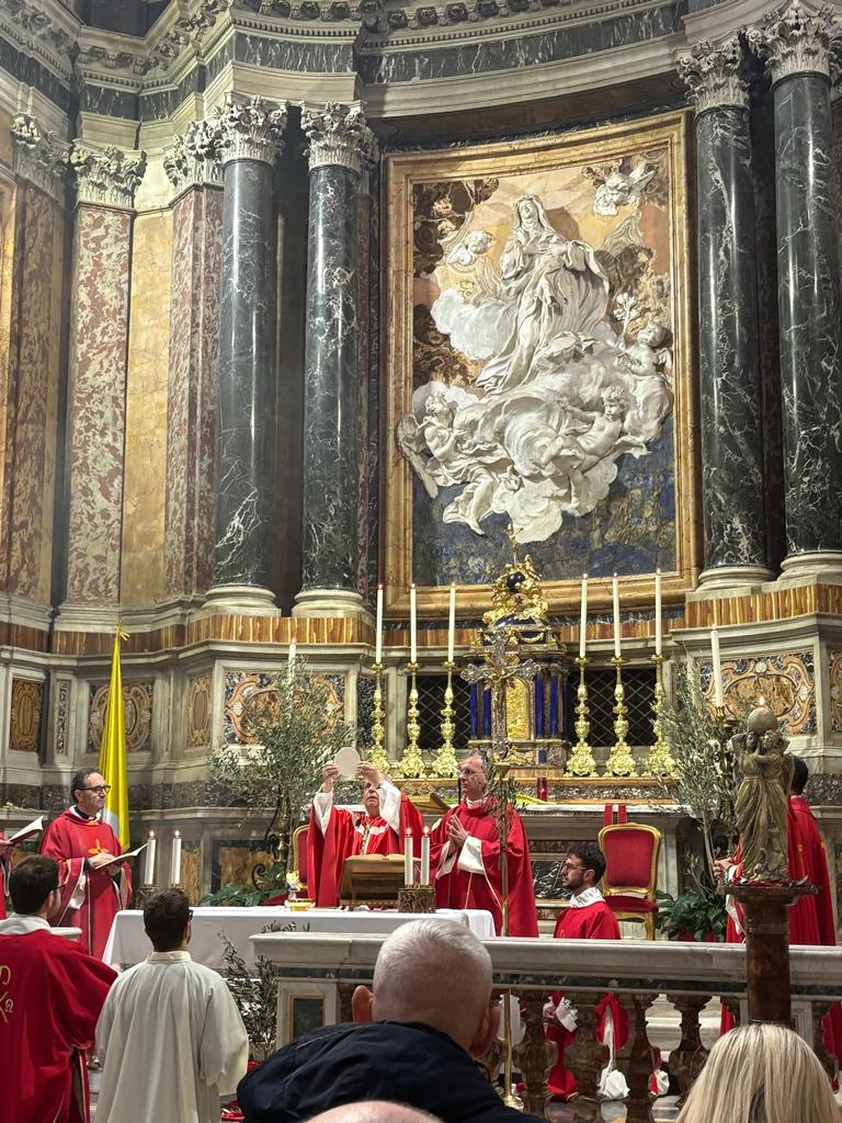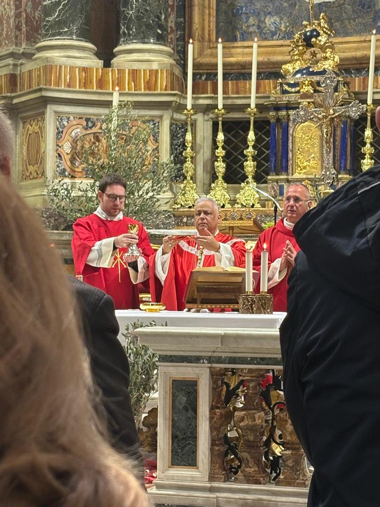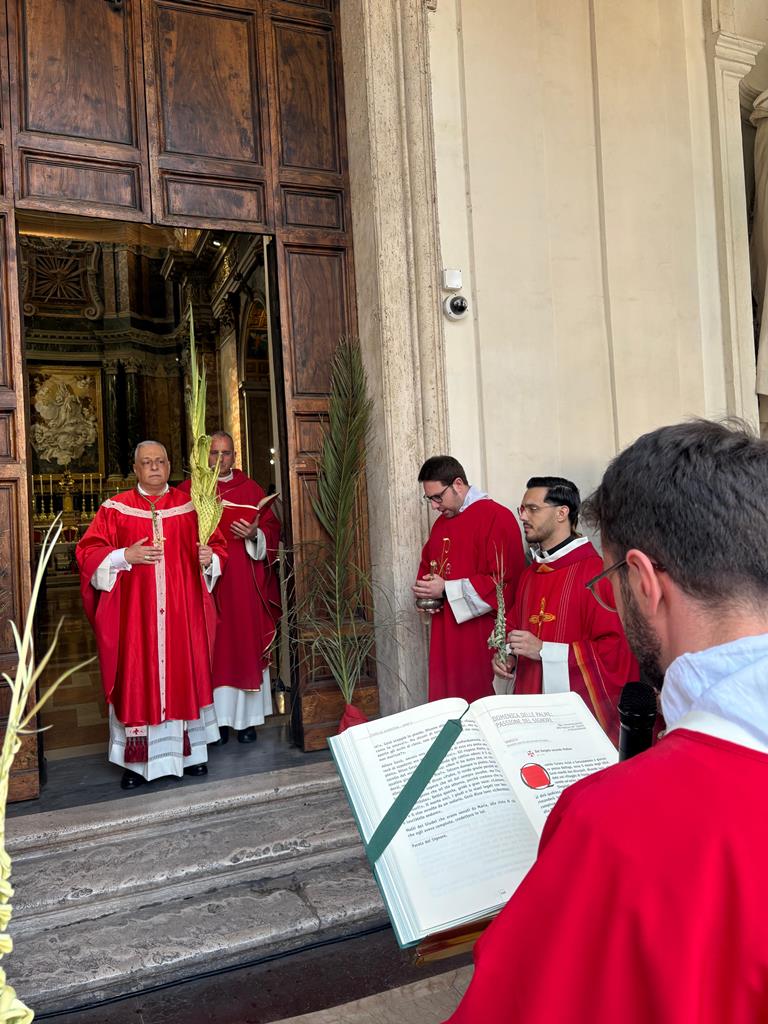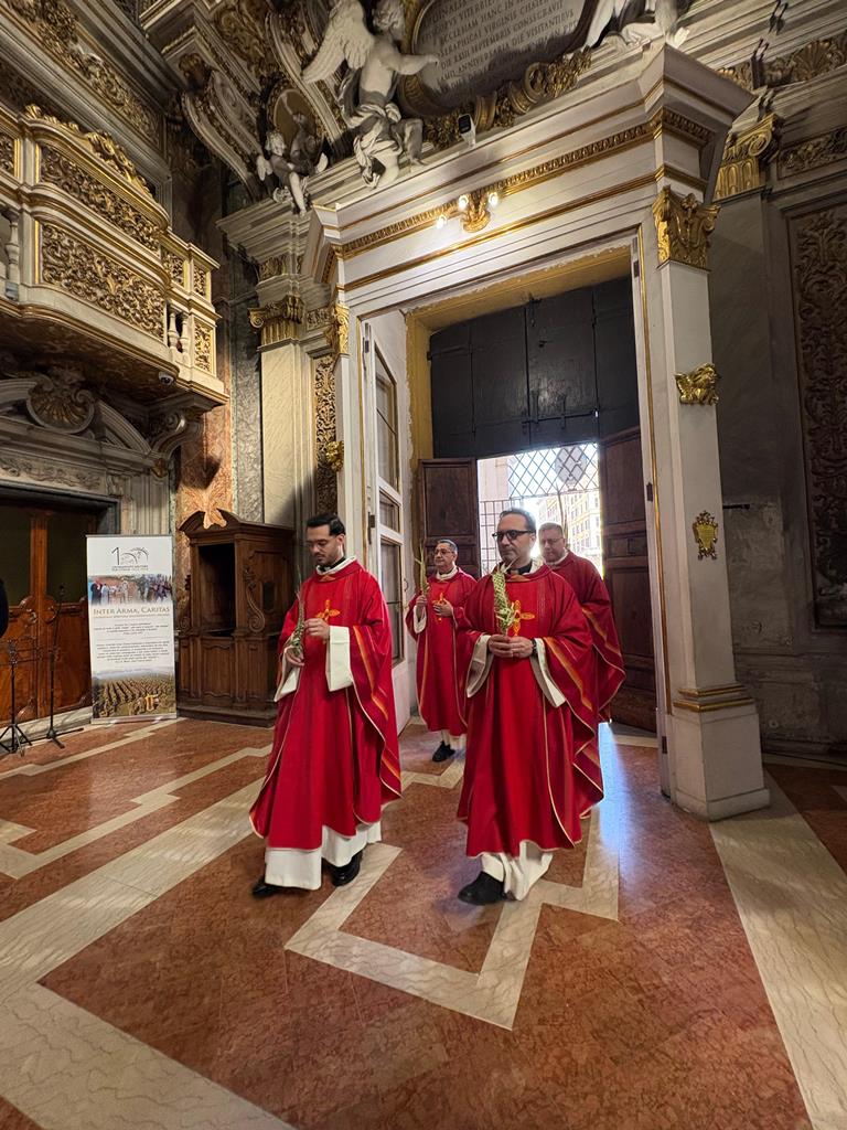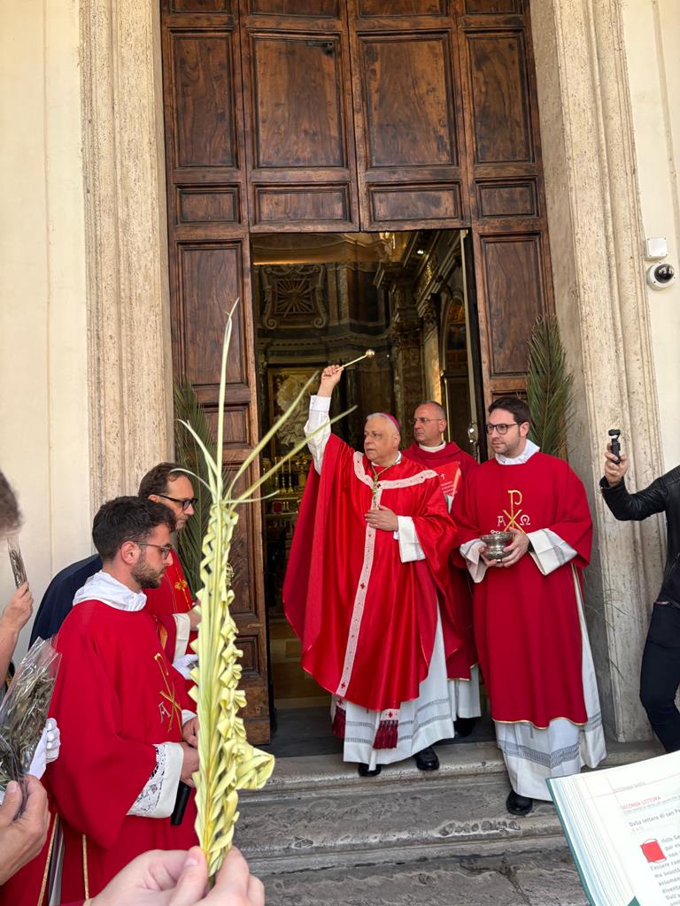 (29-03-2026) Nella magnifica cornice della chiesa principale dell’Ordinariato, Santa Caterina a Magnanapoli, l’arcivescovo castrense Gian Franco Saba ha presieduto la messa delle Palme. Concelebranti il segretario particolare don Giovanni Tanca, il rettore don Pasquale Madeo, oltre a don Gianfranco Pilotto, don Giuseppe Praticò e don Rino De Paola, presenti pure i diaconi Salvatore Guarneri e Sebastiano Marrone.
