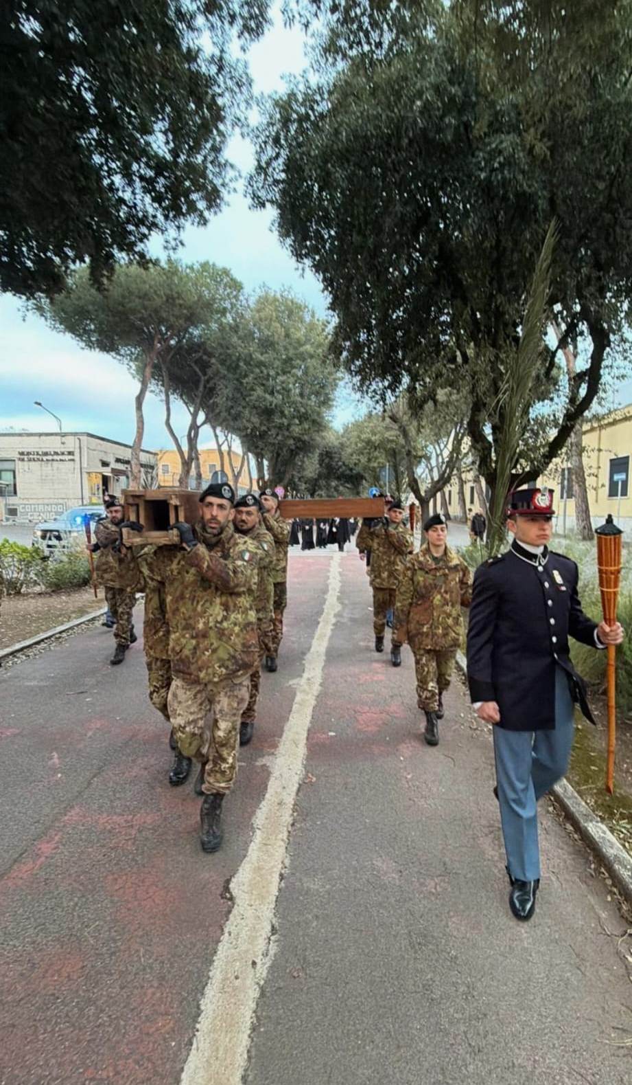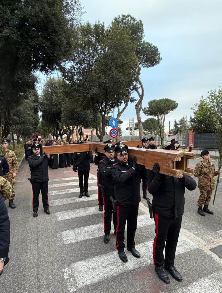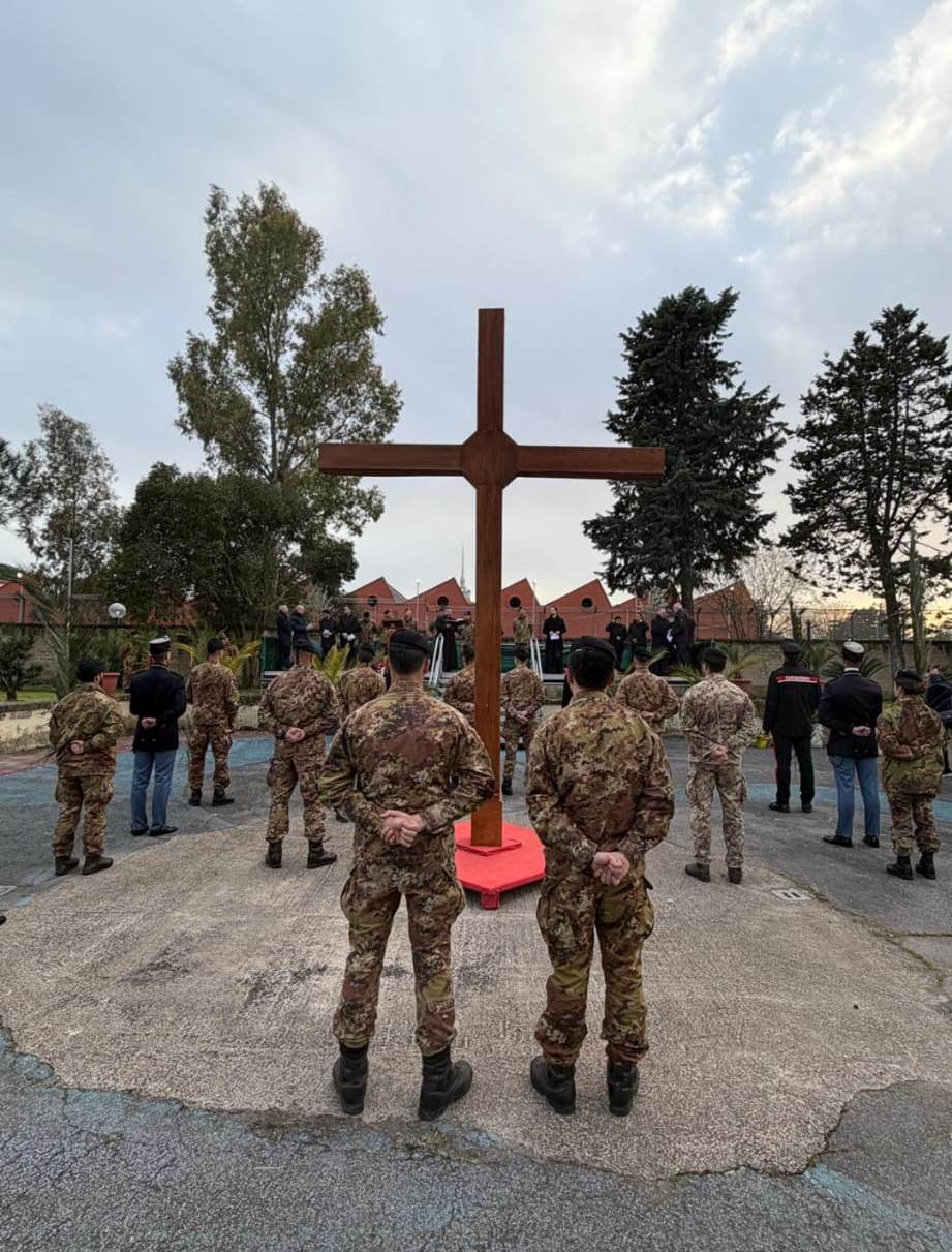 In cammino tra i fedeli e comandi dei Reparti e degli Enti della Città Militare, con una nutrita rappresentanza di militari che hanno devotamente accompagnato la imponente croce issata, al termine, sul sagrato della Scuola Allievi.