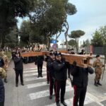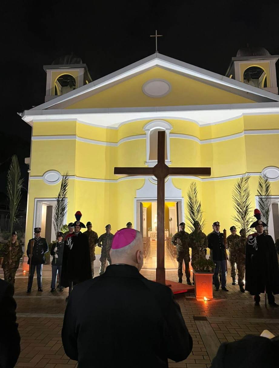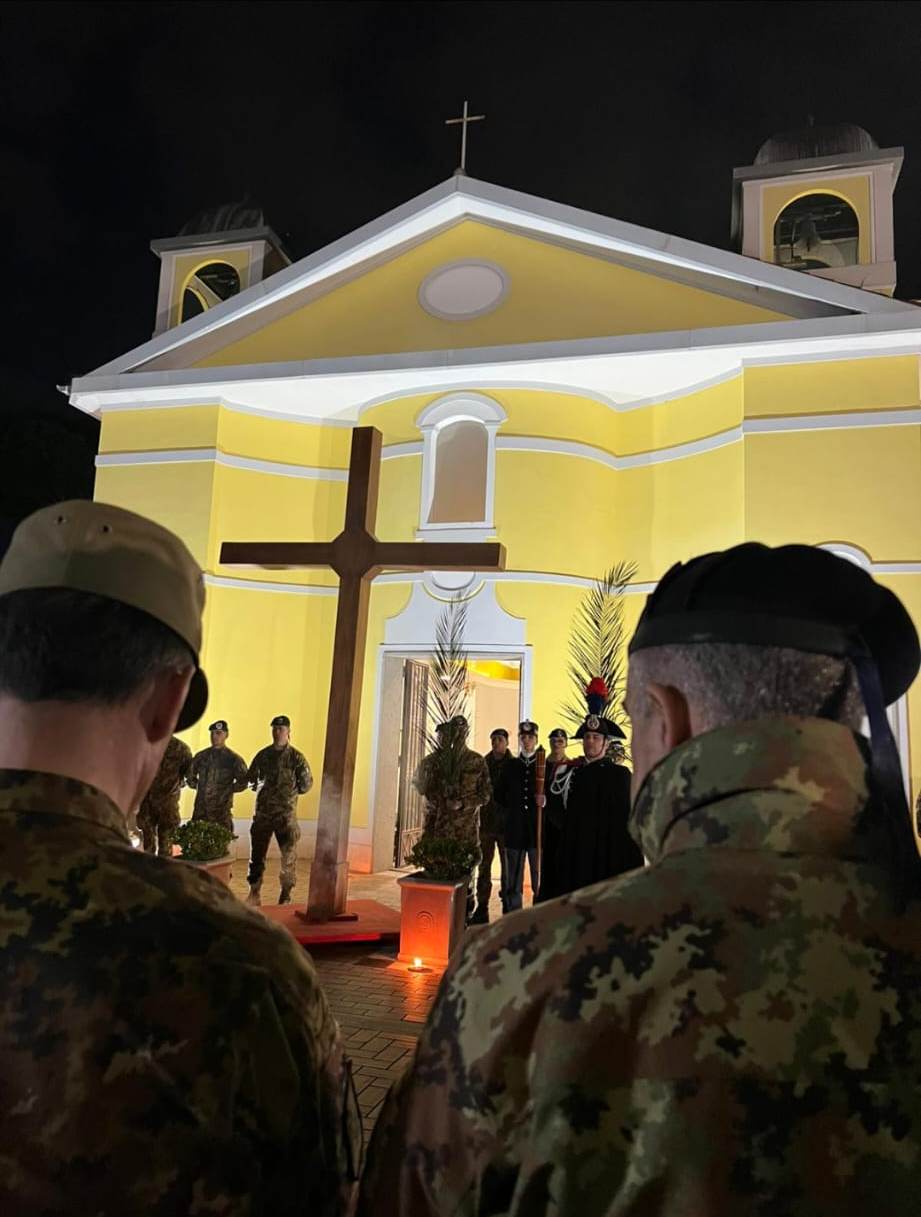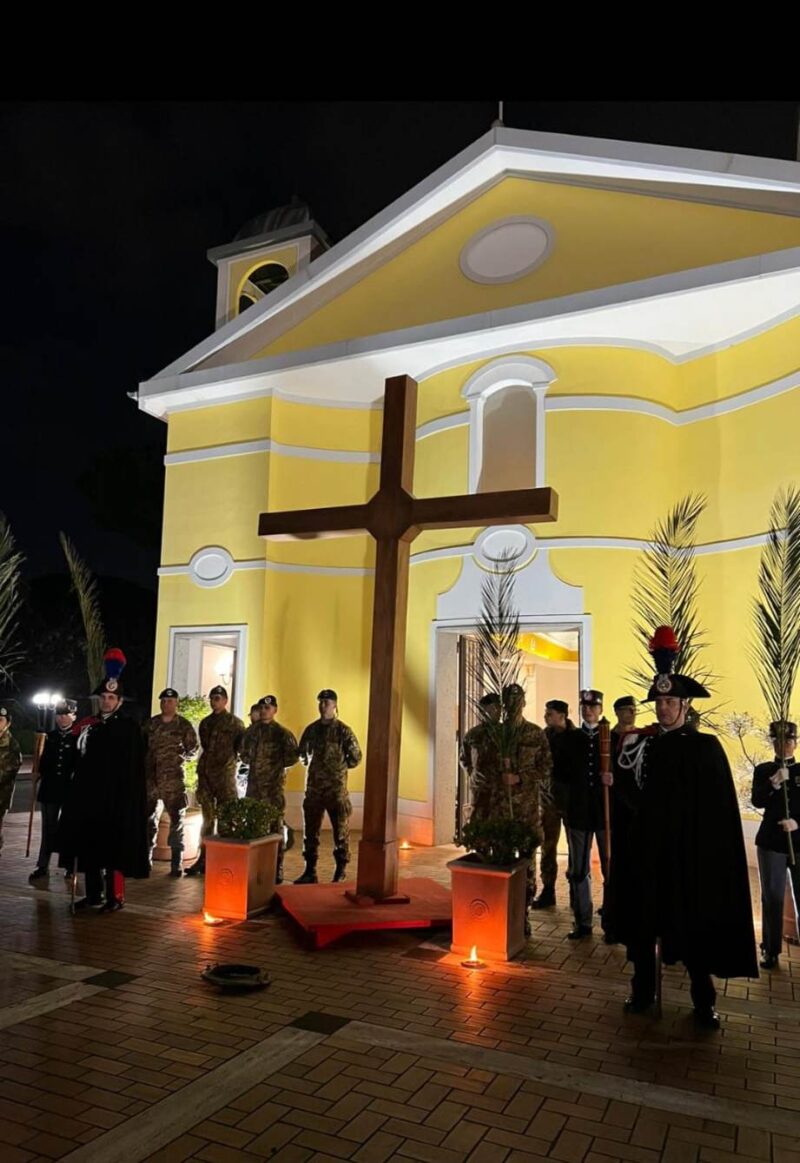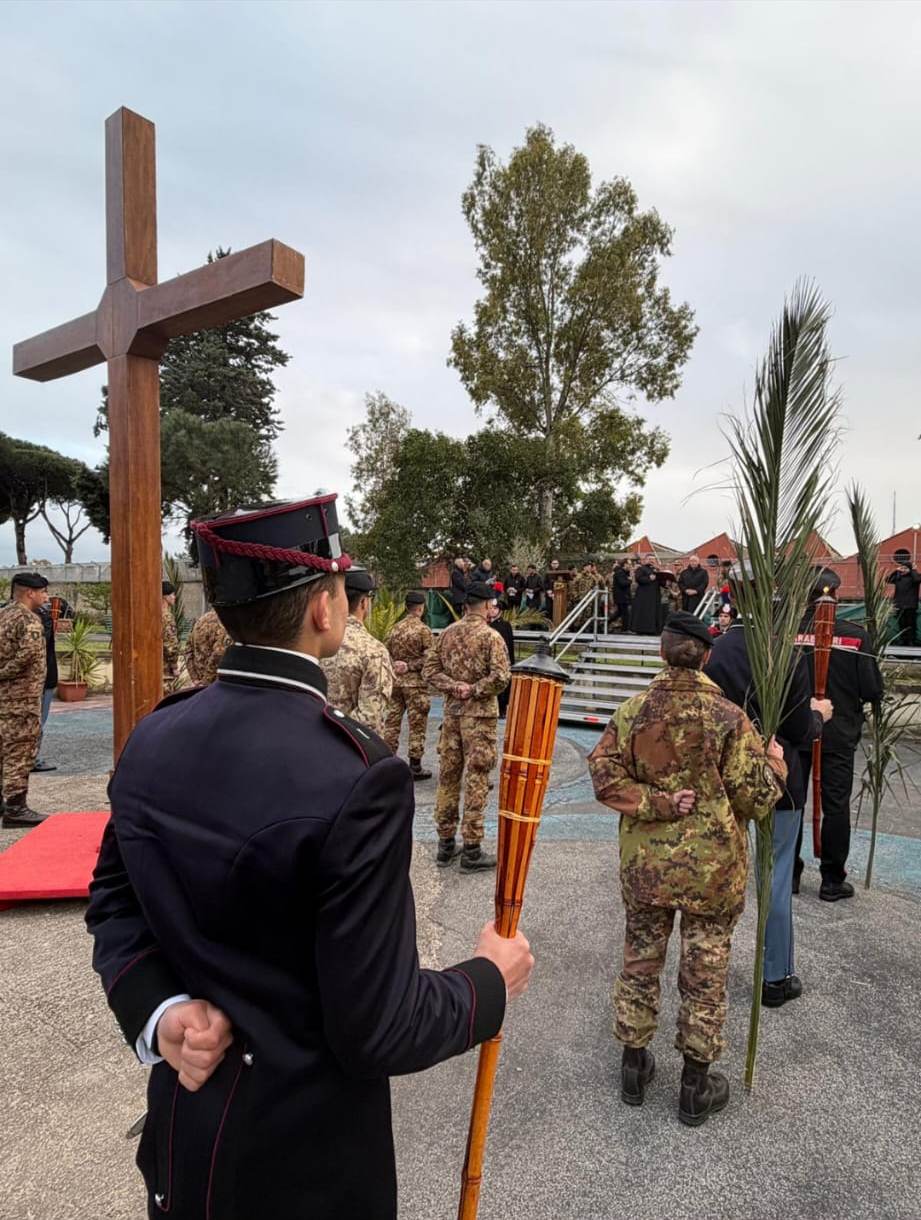 In cammino tra i fedeli e comandi dei Reparti e degli Enti della Città Militare, con una nutrita rappresentanza di militari che hanno devotamente accompagnato la imponente croce issata, al termine, sul sagrato della Scuola Allievi.