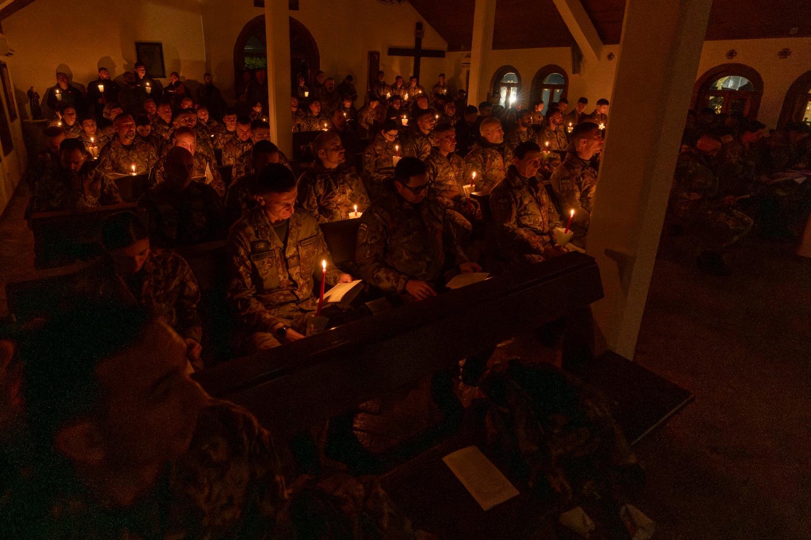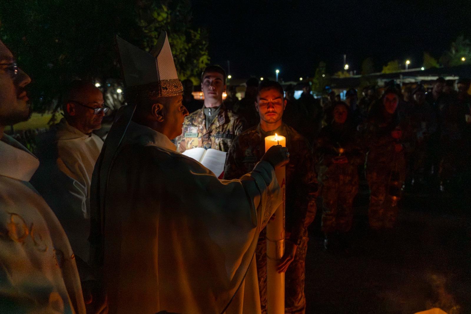 La sera, insieme ai militari italiani presenti nella missione, è stata celebrata la solenne Veglia Pasquale. In un clima di intensa partecipazione spirituale, si è svolta la liturgia con la benedizione del fuoco, seguita dalla liturgia della luce e dalla processione con il cero pasquale, fino allo svolgimento completo della Veglia.
